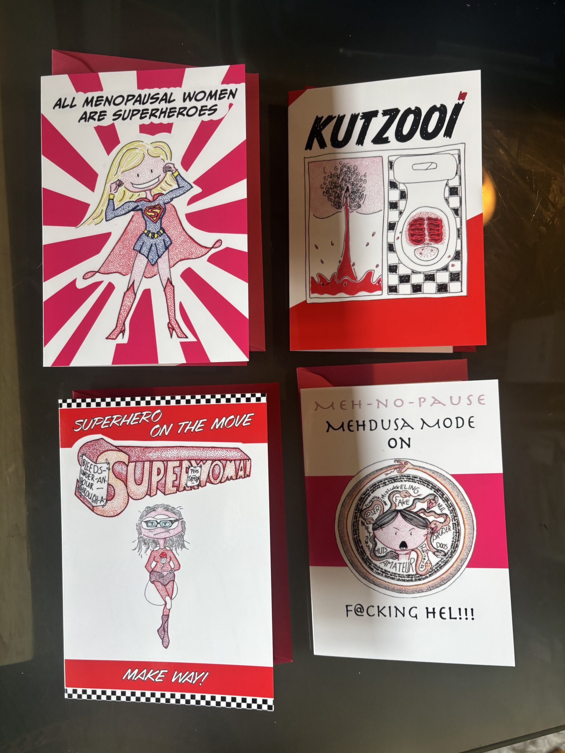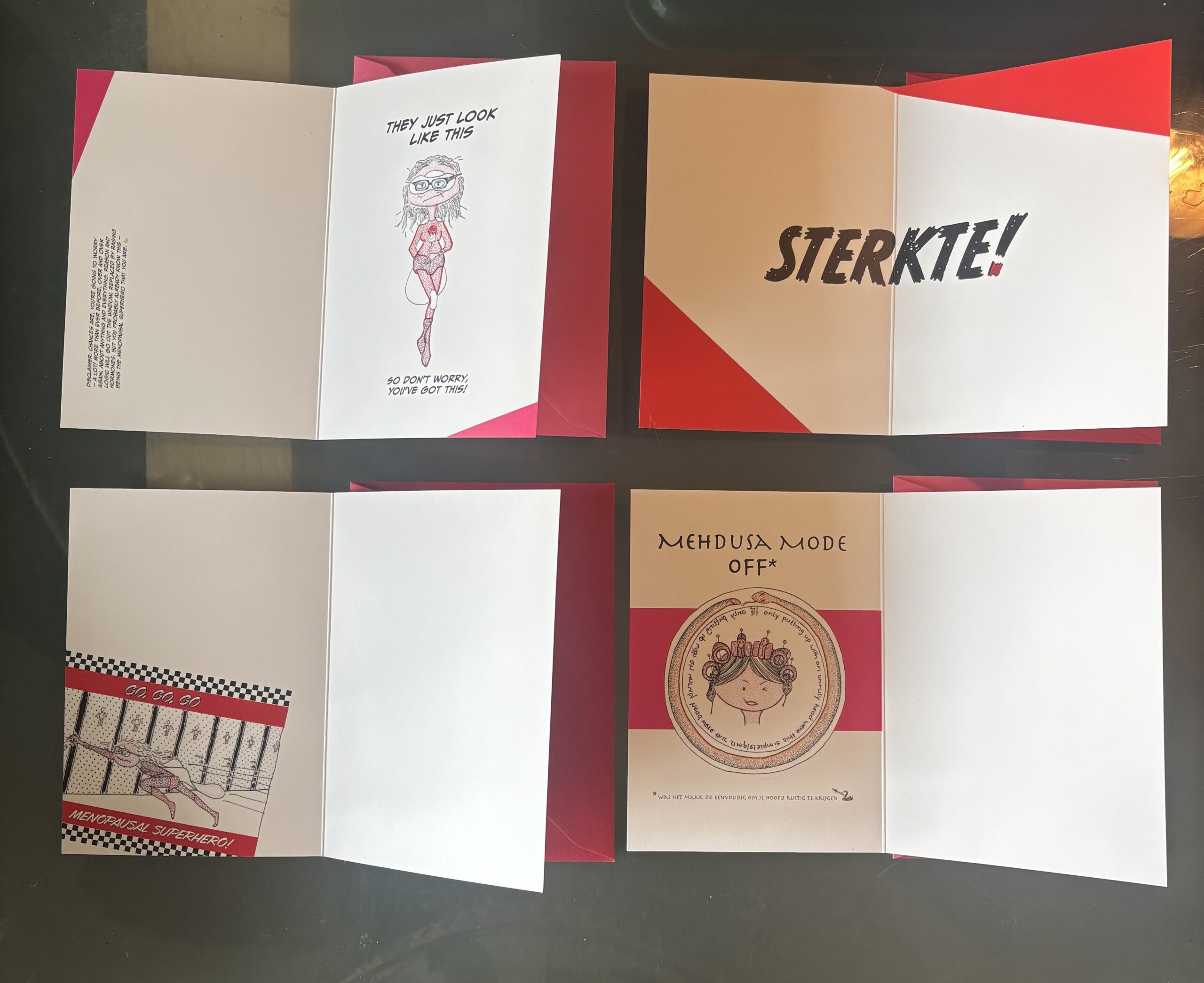 Set van 4 dubbele ansichtkaarten van 350 grams sulfaatkarton, geleverd met bijpassende (rode of roze) envelop