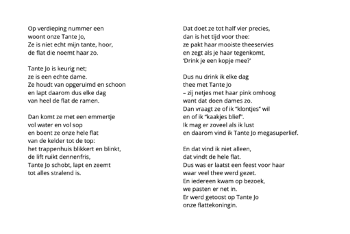 Ik woon in een flat en stel je graag voor aan Tante Jo, Eef en Lot, meneer Bouhali, de hondenman en alle anderen.